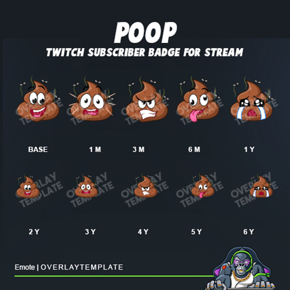 Introducing our thousand of emotes designs to complete your Stream Chanel. This Poop EMOTE is featuring poop design with various cute expressions. It is very strange, unique and funny character. It is perfect for creative, fun and unique streamers.