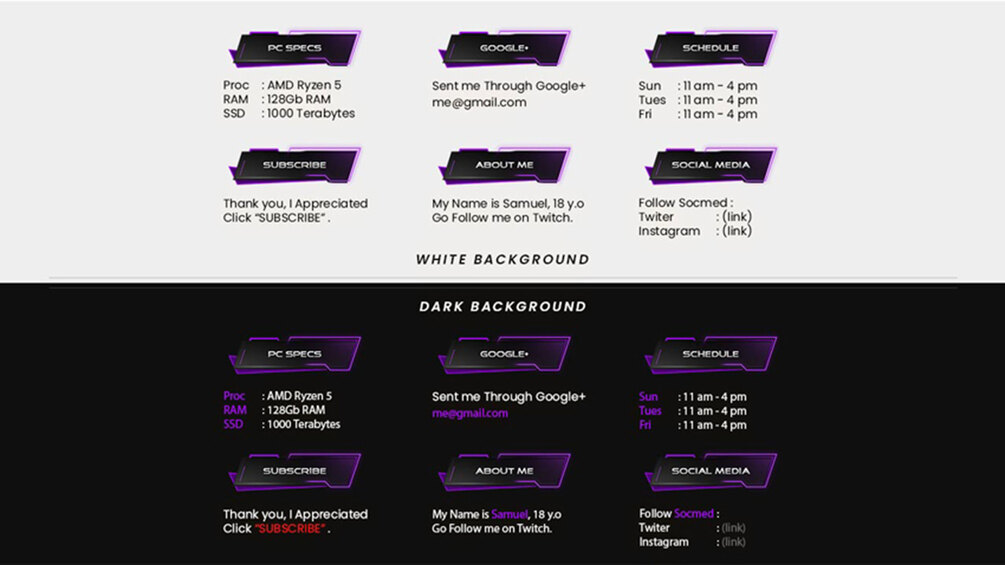 Here you will find many awesome Panel designs for your Chanel display. We provide a dark purple in aggressive, modern and futuristic stream design that represent creative, energetic, smart and strong character. All panels are ready for use for various purposes. Find the best Twitch panel design you need to help you successfully meet the goals for your Chanel